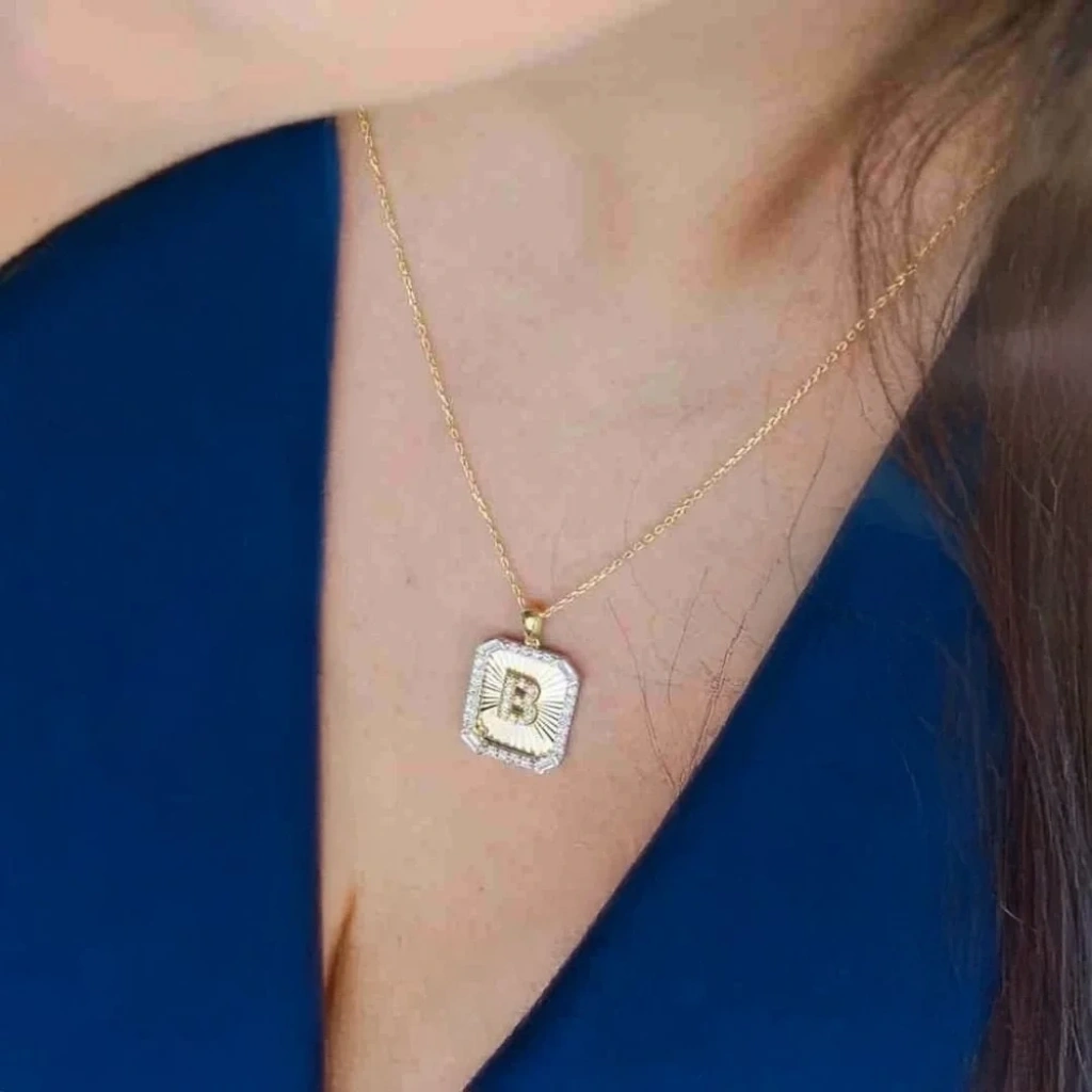 14 Ayar altın Ezme Küp Zincirli Taşlı Harf Kolye